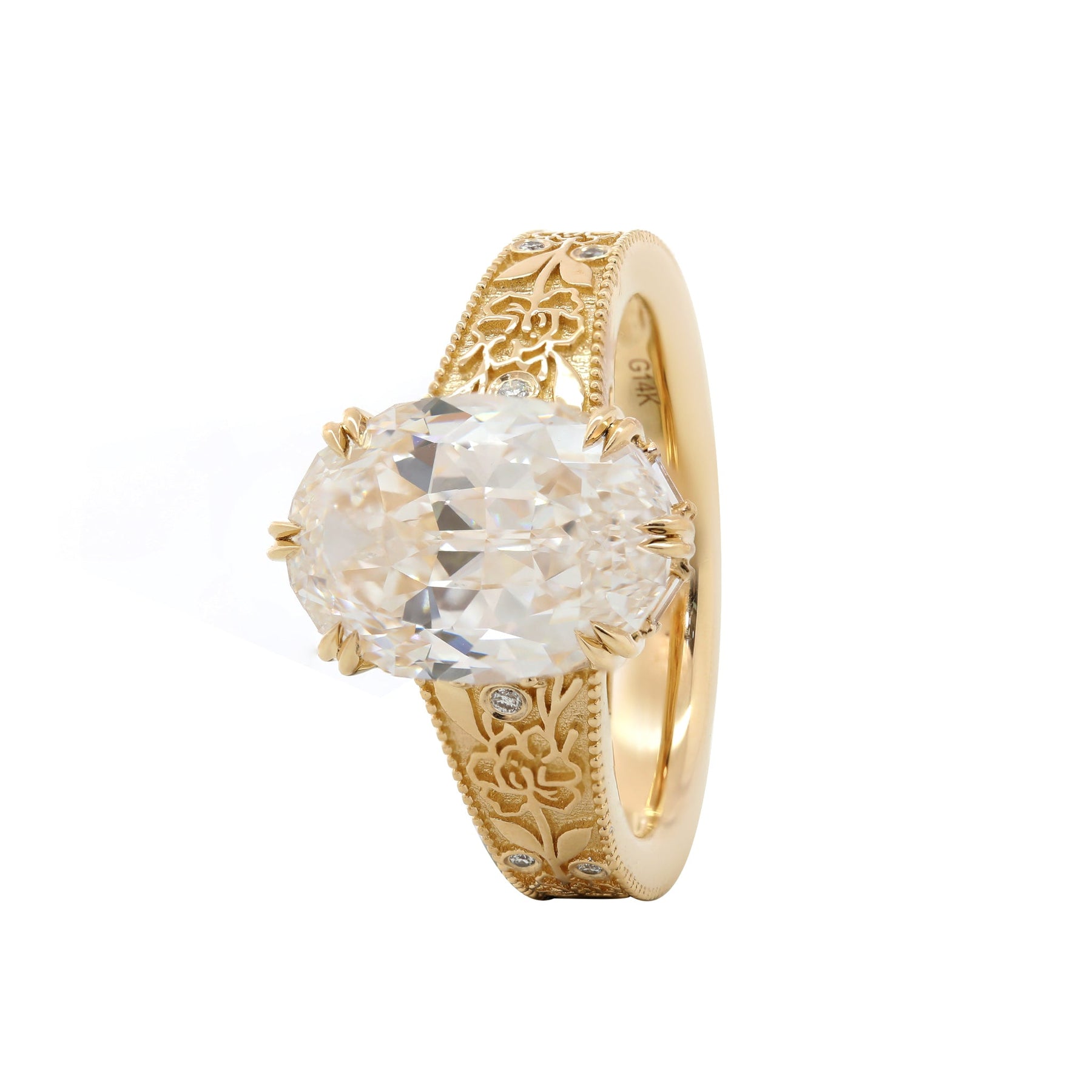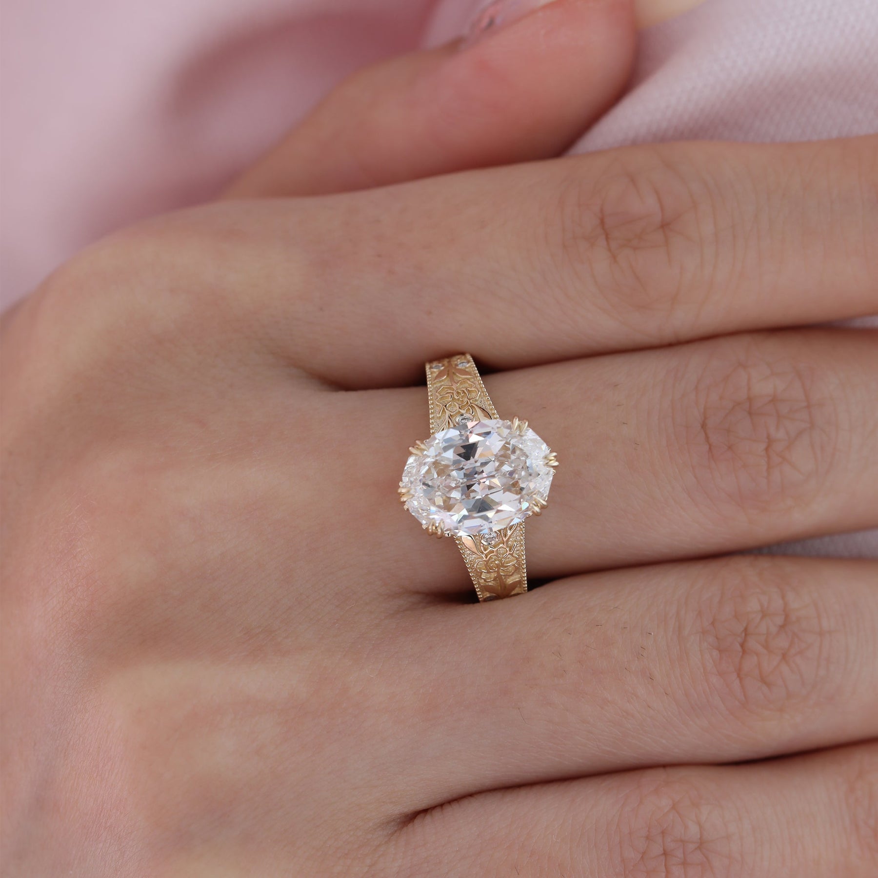 5.16CT Oval Ashoka Cut Lab Diamond Double Prong Hand-Engraved Wide Ban