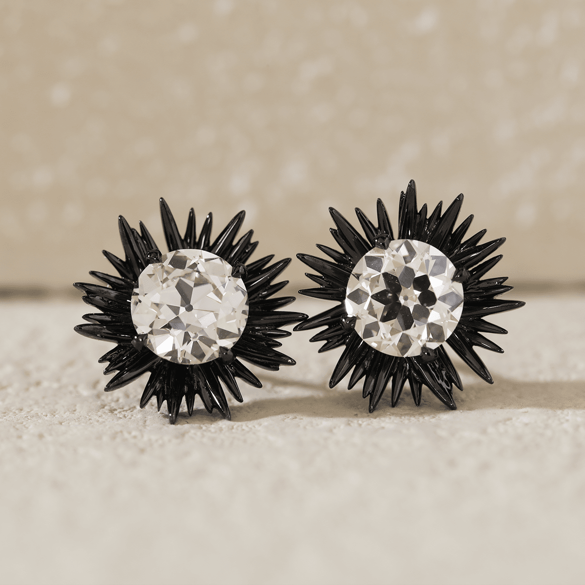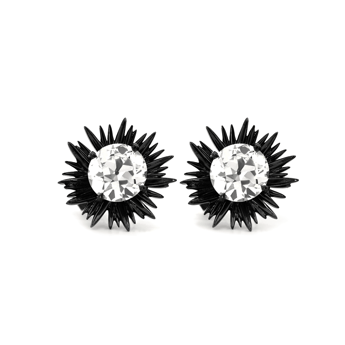 Old European-Cut Lab Diamond Sea Urchin Stud Earrings in Black Rhodium-Plated Two-Tone Metal
